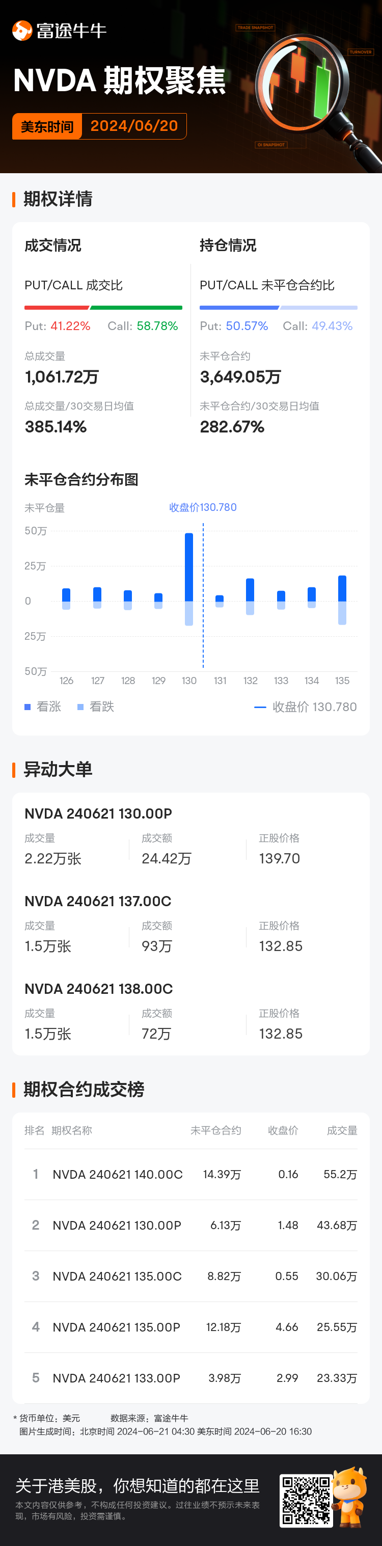 美东时间6月20日,$英伟达 (NVDA.US)$期权成交活跃,当日期权总成交量达1,061.72万张,其中看跌期权占总成交量的41.22%,看涨期权占58.78%。