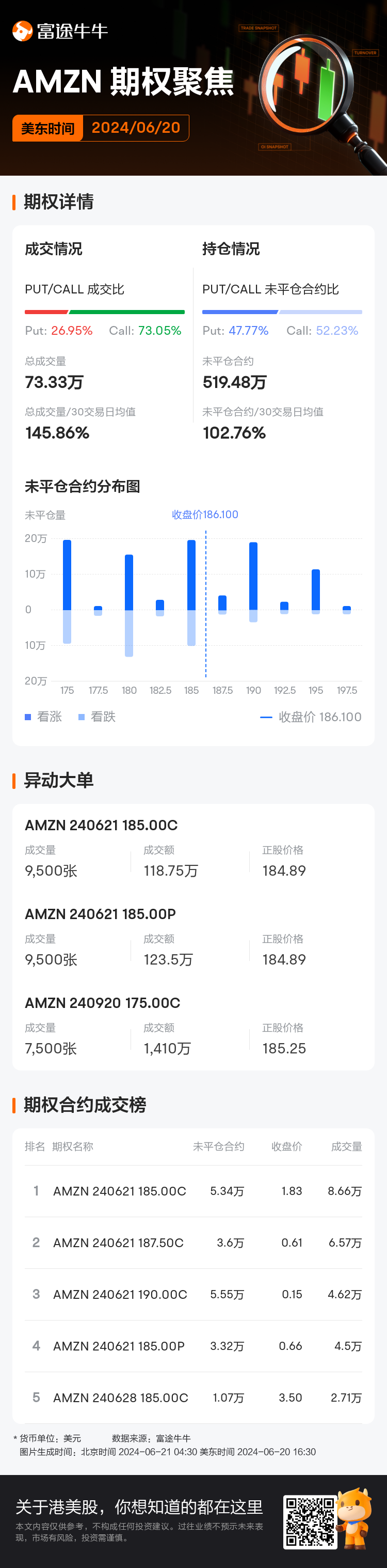 美东时间6月20日,$亚马逊 (AMZN.US)$期权成交活跃理财杠杆,当日期权总成交量达73.33万张,其中看跌期权占总成交量的26.95%,看涨期权占73.05%。
