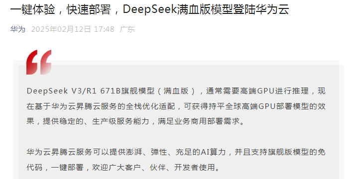 据华为微信12日消息,DeepSeek满血版模型登陆华为云。华为称,DeepSeek V3/R1 671B旗舰模型(满血版),通常需要高端GPU进行推理,现在基于华为云昇腾云服务的全栈优化适配什么叫做杠杆炒股,可获得持平全球高端GPU部署模型的效果,提供稳定的、生产级服务能力,满足业务商用部署需求。